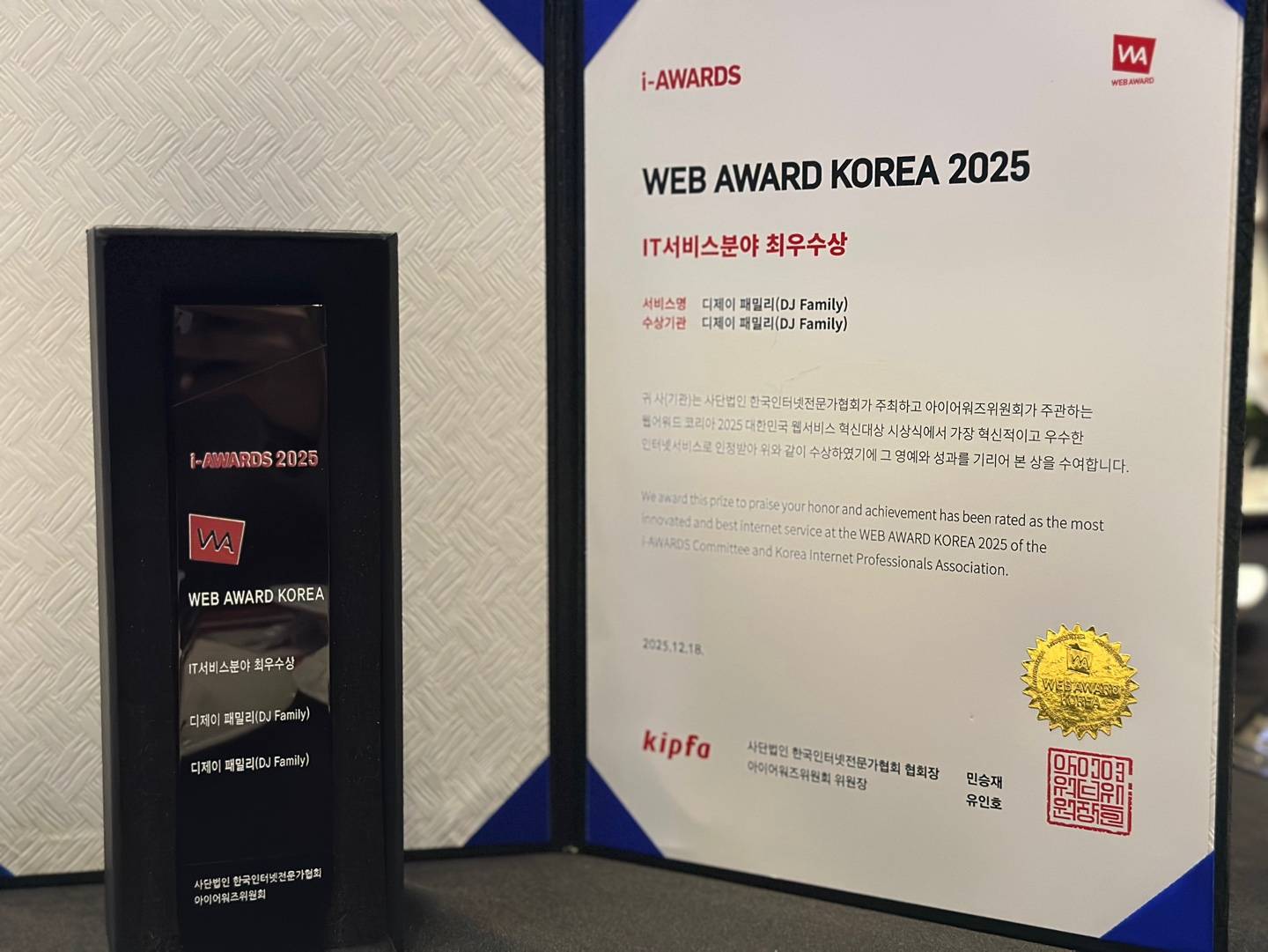 [마이데일리 = 천주영 기자] 경북 안동에 본사를 둔 IT 전문 기업 디제이패밀리가 국내 최고 권위의 웹 평가 시상식인 ‘2025 웹어워드코리아’에서 IT서비스분야 경북 유일 최우수상을 수상하며, 지역 기반 IT 기업의 저력을 과시했다고 19일 밝혔다.